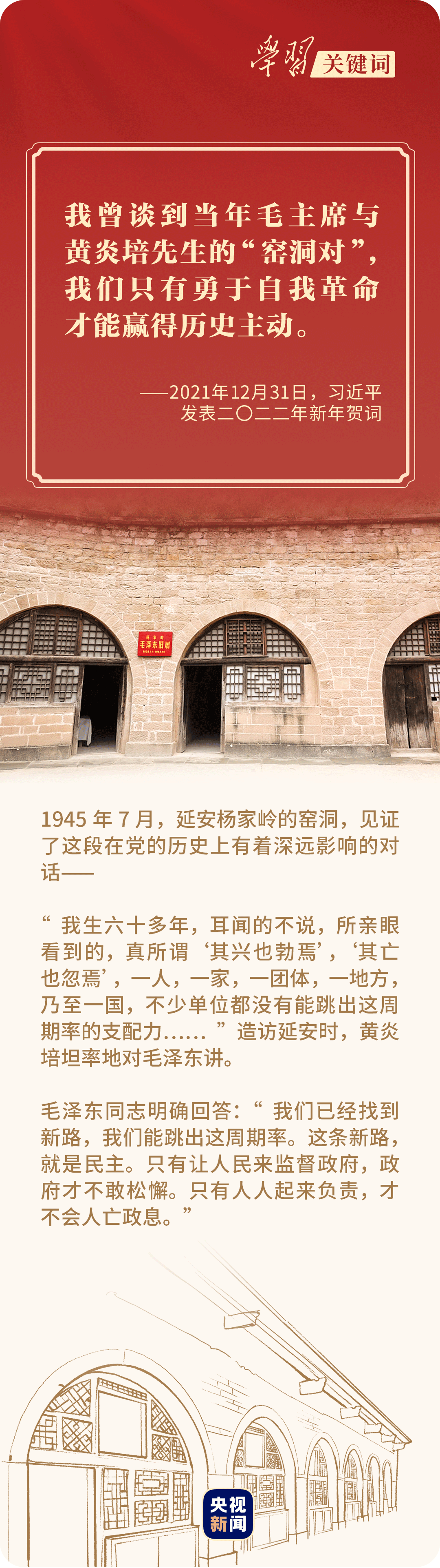 2021年11月11日,在黨的十九屆六中全會上,習(xí)近平總書記給出新解:“毛澤東同志在延安的窯洞里給出了第一個答案,這就是‘只有讓人民來監(jiān)督政府,政府才不敢松懈’。經(jīng)過百年奮斗特別是黨的十八大以來新的實(shí)踐,我們黨又給出了第二個答案,這就是自我革命。”