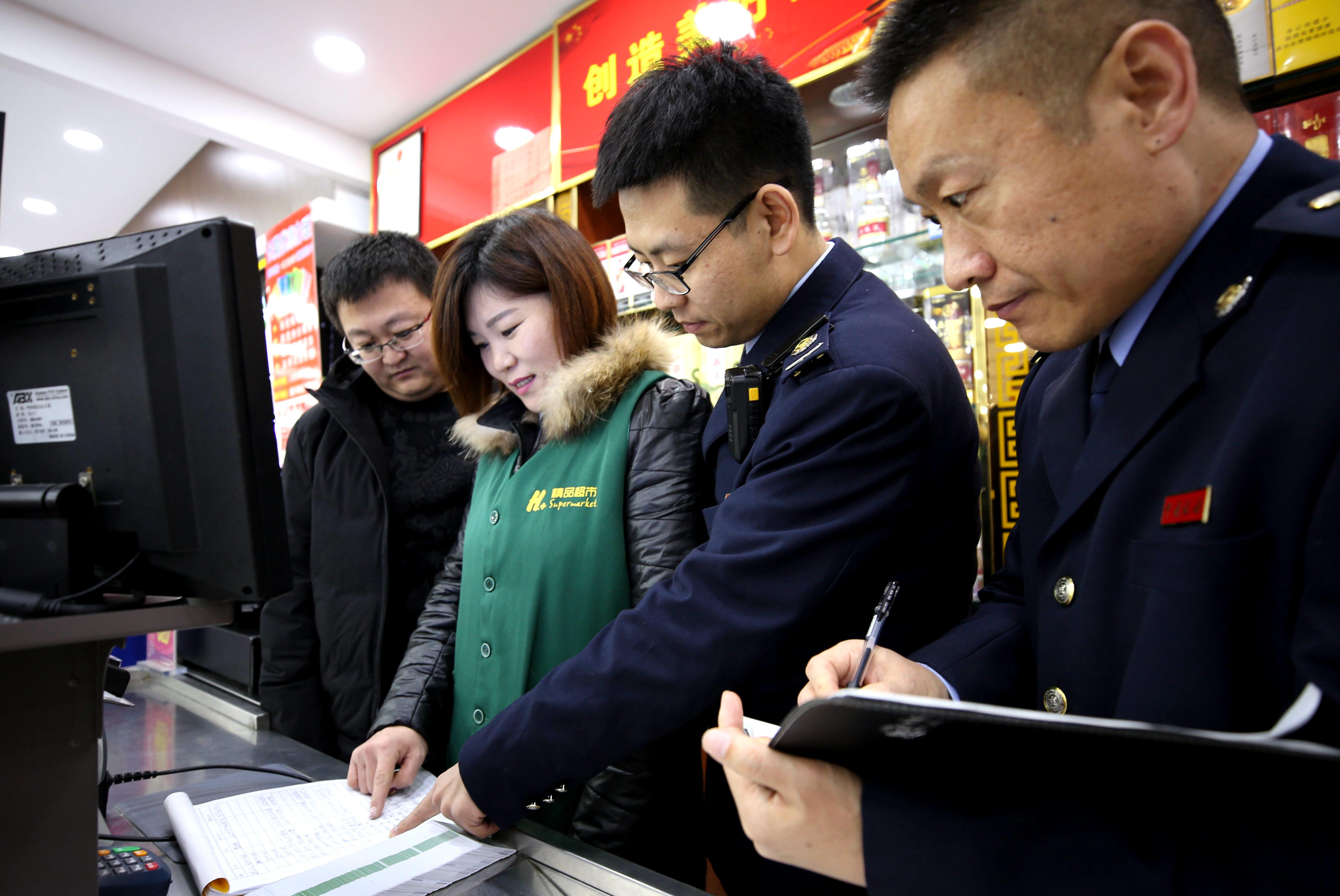 河北大廠回族自治縣紀(jì)檢干部和稅務(wù)部門稽查人員在一家超市檢查是否有單位公款購買購物卡情況(2019年1月22日攝)。新華社記者 王曉 攝
