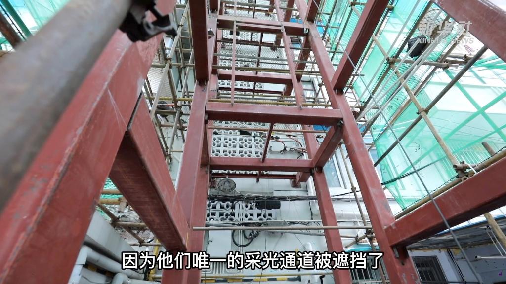 這批六層的住宅房齡已接近40年,雕花處是加裝電梯的唯一位置。但隨著腳手架慢慢搭起,每層樓的中間兩戶居民有了意見,因為他們唯一的采光通道被遮擋了。