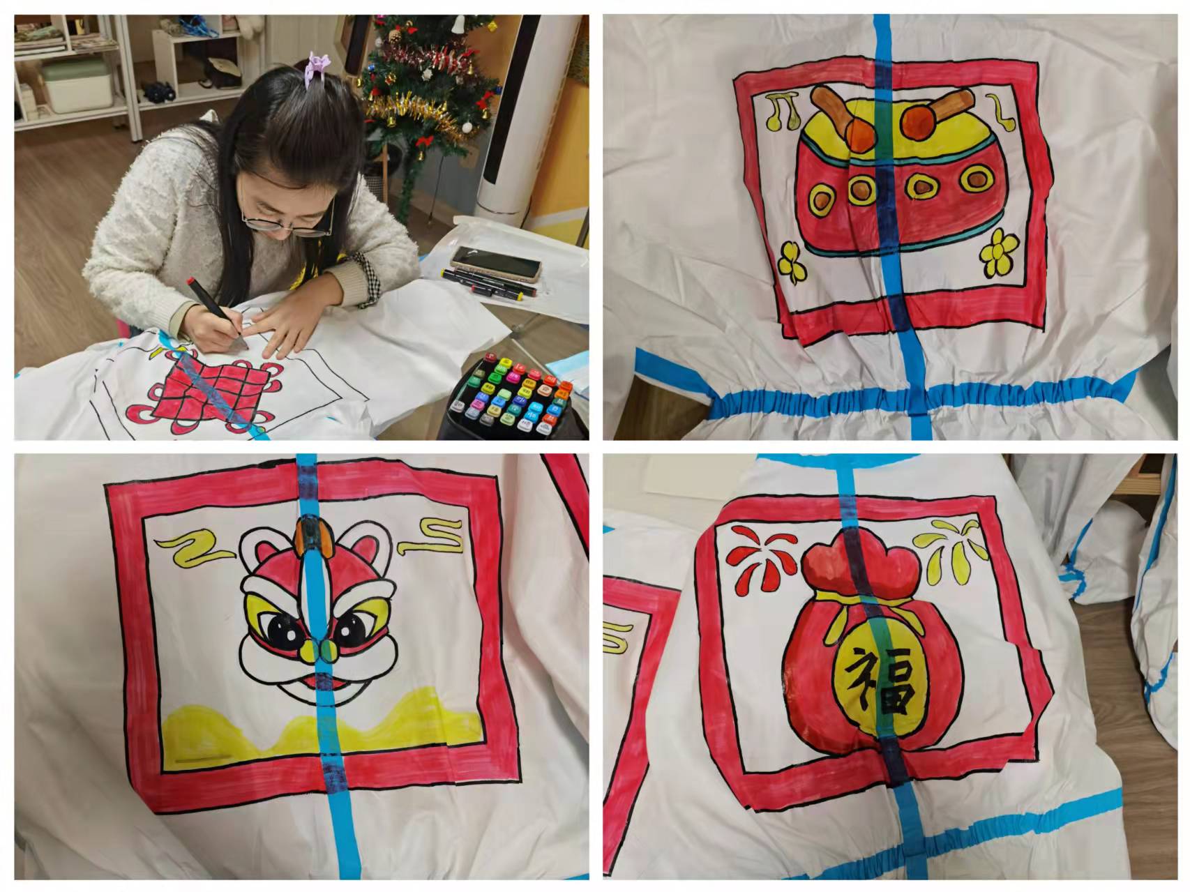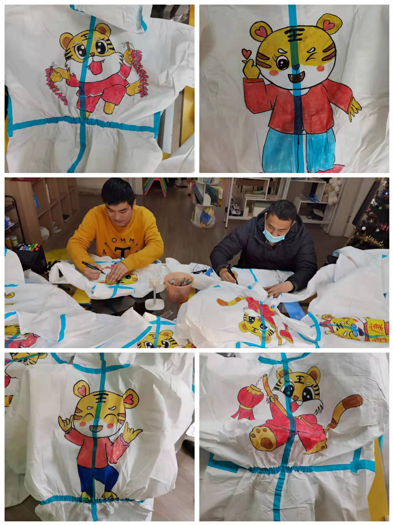 憨態(tài)可掬的小老虎,有的瞇縫著眼睛,有的張開(kāi)嘴巴,有的捧著鞭炮,有的打著燈籠,還有的雙手捧“福”到家……這些五彩繽紛的圖案,出現(xiàn)在雁塔區(qū)杜城街道中鐵尚都城社區(qū)一批志愿者的防護(hù)服上,引人注目。