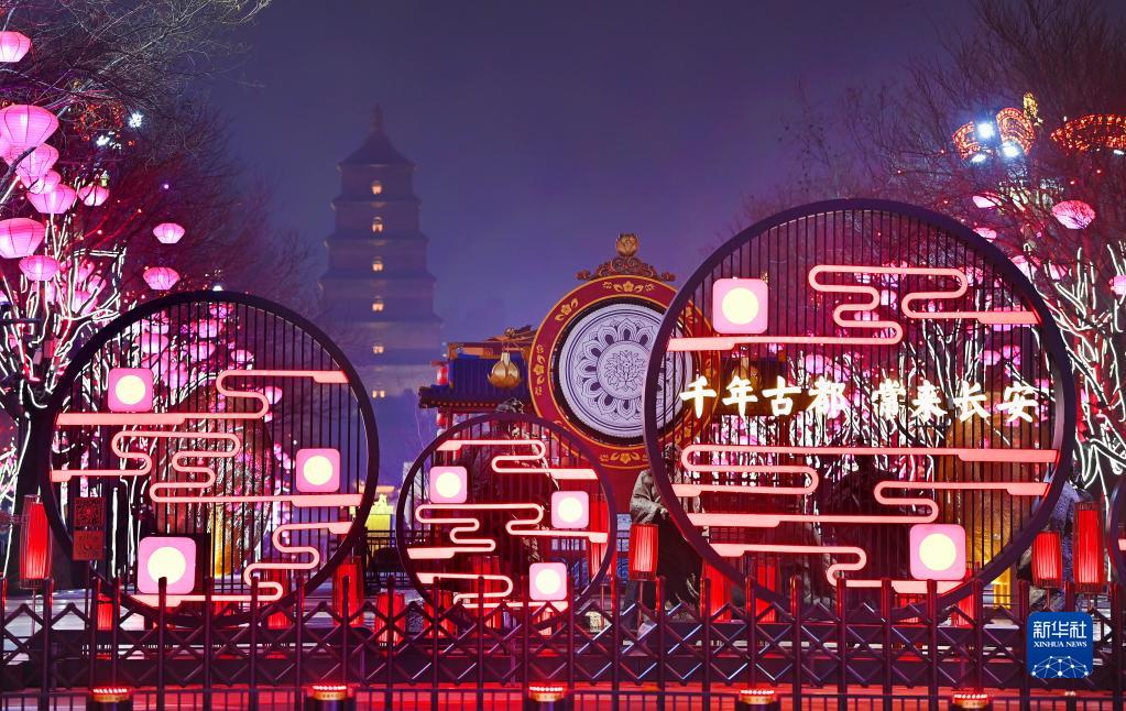 春節(jié)臨近,西安市大唐不夜城點(diǎn)亮璀璨奪目的燈光,迎接新春佳節(jié)的到來。