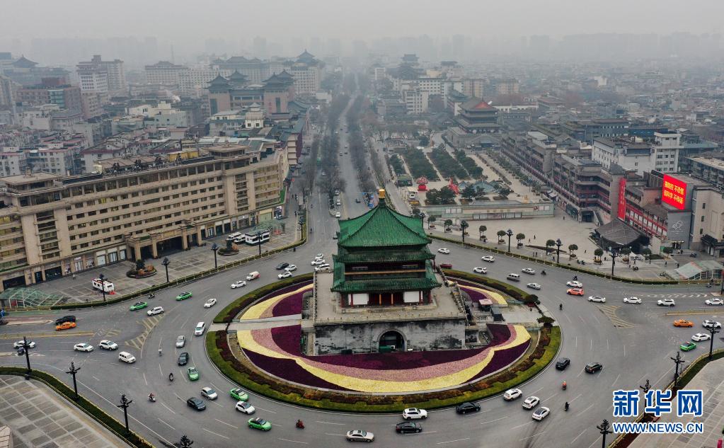 1月22日,西安市鐘樓盤道再現(xiàn)車水馬龍的景象(無人機照片)。新華社記者 陶明 攝