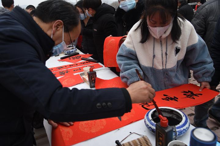 1月24日,厙弆村“三下鄉(xiāng)”現(xiàn)場(chǎng),書法愛(ài)好者為群眾書寫春聯(lián)。(新華社記者崔翰超 攝)