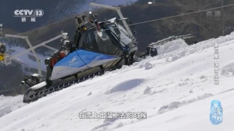 壓雪車,十幾噸重,巨大的絞盤和纜繩牽引著,在傾斜度接近30度的坡面上完成壓雪工作。賽道上還常有近45度角的急轉(zhuǎn)彎。