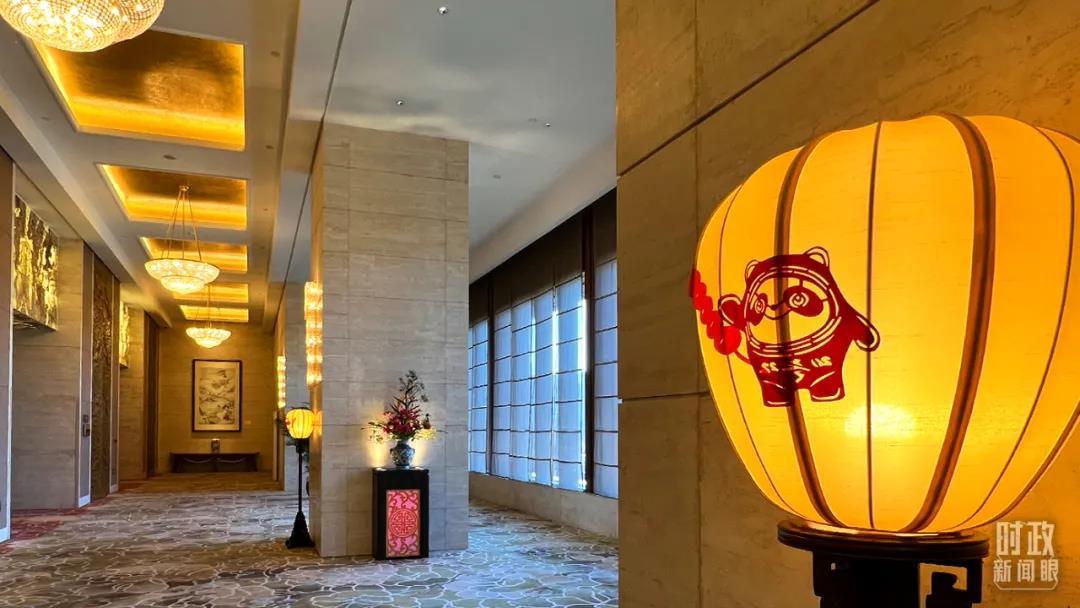 △芳華苑大廳擺放著兩國(guó)國(guó)旗,國(guó)旗后是《六合同春圖》。六合是指天地四方(天地和東南西北),六合同春便是天下皆春,萬(wàn)物欣欣向榮。(總臺(tái)央視記者楊波拍攝)