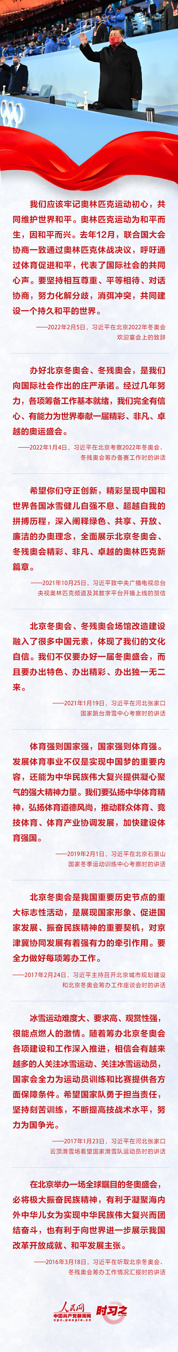 2022年2月20日晚,2萬盞燈籠點亮國家體育場,“中國紅”與“冰雪白”交相輝映,舉世矚目的北京冬奧會在運(yùn)動員們的歡樂聚會中落下帷幕。冬奧競技場上,一個個精彩瞬間、一幕幕動人場景,使人心潮澎湃。同筑冰雪夢,一起向未來。讓我們重溫習(xí)近平的鏗鏘話語,共同感受體育傳遞出的強(qiáng)大精神力量。