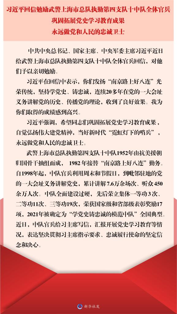 武警上海市總隊(duì)執(zhí)勤第四支隊(duì)十中隊(duì)1952年由抗美援朝歸國骨干抽組而成,1982年接替“南京路上好八連”勤務(wù)。自1998年起,中隊(duì)官兵利用周末和節(jié)假日,到毗鄰駐地的黨的一大會(huì)址義務(wù)講解黨史,累計(jì)講解7.6萬余場次、聽眾450余萬人次。中隊(duì)全面建設(shè)過硬,先后榮立集體一等功3次、二等功11次、三等功19次,榮獲國家級和省部級表彰獎(jiǎng)勵(lì)17項(xiàng),2021年被確定為“學(xué)黨史鑄忠誠的模范中隊(duì)”全國典型。近日,中隊(duì)官兵給習(xí)主席寫信,匯報(bào)開展黨史學(xué)習(xí)教育等情況,表達(dá)堅(jiān)決貫徹習(xí)主席指示要求、忠誠履行使命的堅(jiān)定信念和決心。