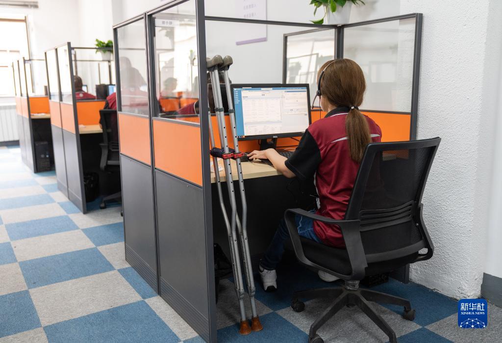 在北京圓通速遞助殘基地暨北京共享客服中心,一名殘疾人員工在工作(2021年5月16日攝)。新華社記者 才揚 攝