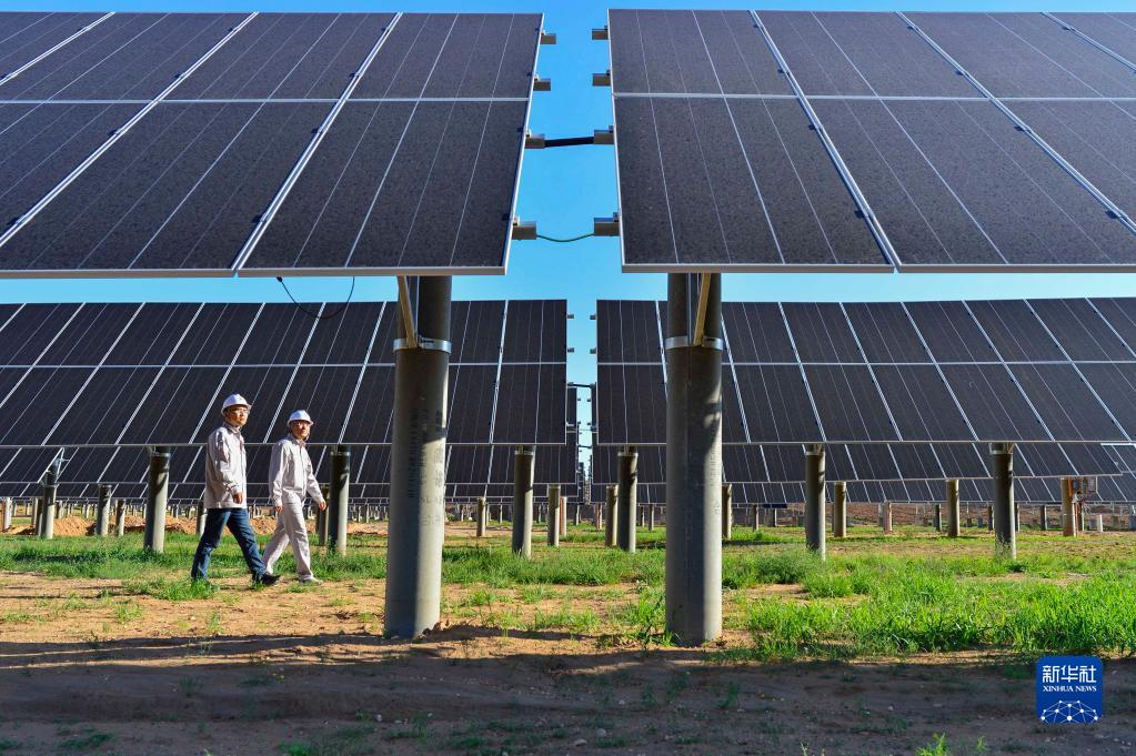 工作人員在內(nèi)蒙古自治區(qū)鄂爾多斯市伊金霍洛旗天驕綠能50萬千瓦采煤沉陷區(qū)生態(tài)治理光伏發(fā)電示范項目區(qū)里巡查(2021年7月8日攝)。 新華社發(fā)(王正 攝)