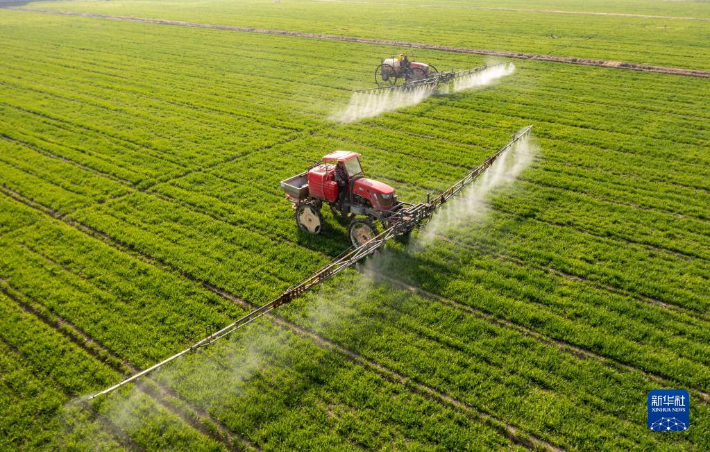 2022年3月9日,在江蘇省海安市大公鎮(zhèn)賁集村,村民駕駛植保機械在小麥田間進行噴灑藥物作業(yè)(無人機照片)。 新華社發(fā)(翟慧勇 攝)