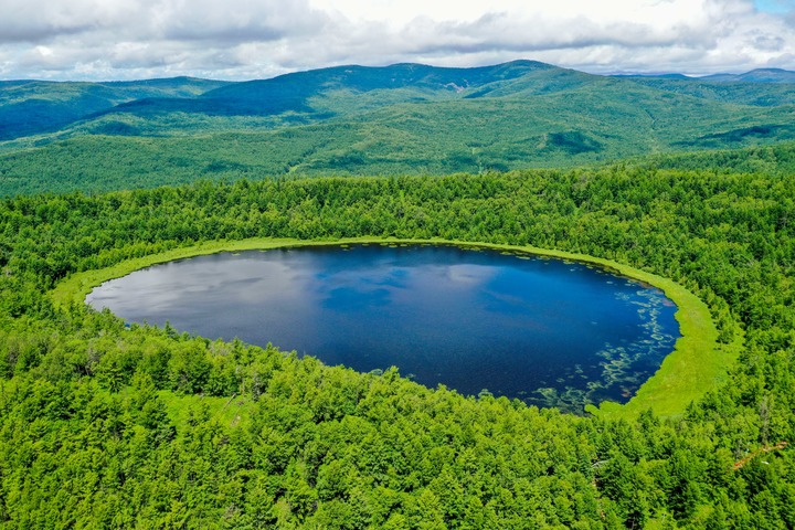 這是內(nèi)蒙古阿爾山國家森林公園內(nèi)的天池(2021年7月14日攝,無人機(jī)照片)。新華社記者 連振 攝