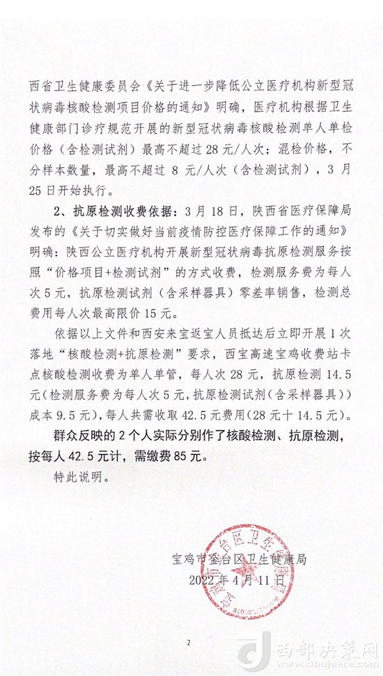 西部決策網(wǎng)接到群眾熱線:近日,西寶高速寶雞收費(fèi)站高速路口核酸檢測(cè)單人42.5元,收費(fèi)過高。記者隨即進(jìn)行實(shí)地調(diào)查并以《熱線調(diào)查|群眾質(zhì)疑高速路口核酸檢測(cè)收費(fèi)過高》為題進(jìn)行報(bào)道。