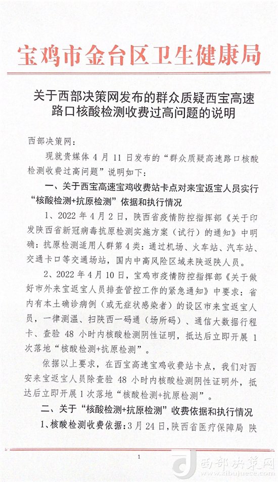 熱線回復(fù)|4月11日,寶雞市金臺(tái)區(qū)衛(wèi)生健康局就“群眾質(zhì)疑高速路口核酸檢測(cè)收費(fèi)過高問題”向西部決策網(wǎng)回復(fù)并進(jìn)行了情況說明。具體內(nèi)容如下:
