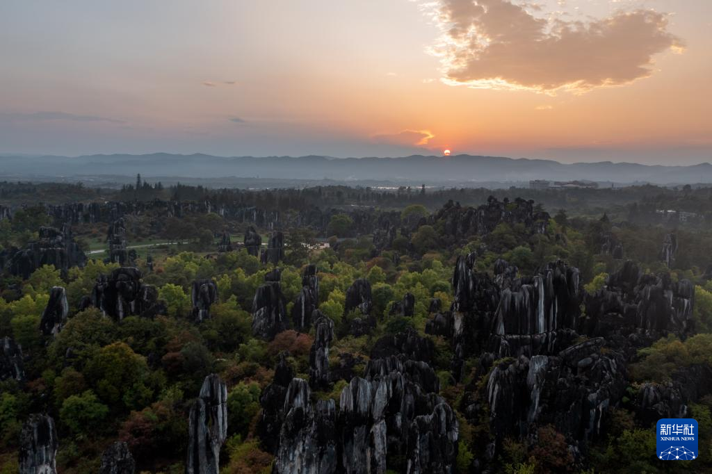 這是4月9日拍攝的石林日落景觀(無(wú)人機(jī)照片)。新華社記者 曹夢(mèng)瑤 攝