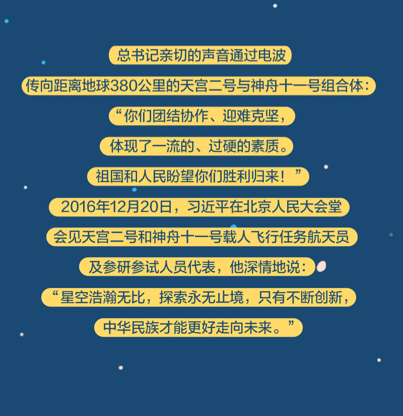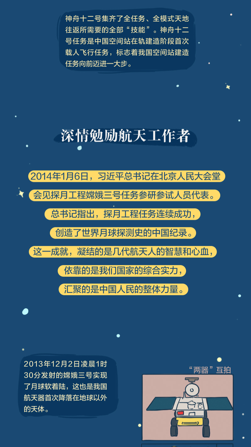 黨的十八大以來(lái),總書記始終高度關(guān)注我國(guó)航天事業(yè)發(fā)展,多次同執(zhí)行任務(wù)的航天員展開“天地通話”、給參與“東方紅一號(hào)”任務(wù)的老科學(xué)家回信、親切接見航天工作者、深情寄語(yǔ)航天人……