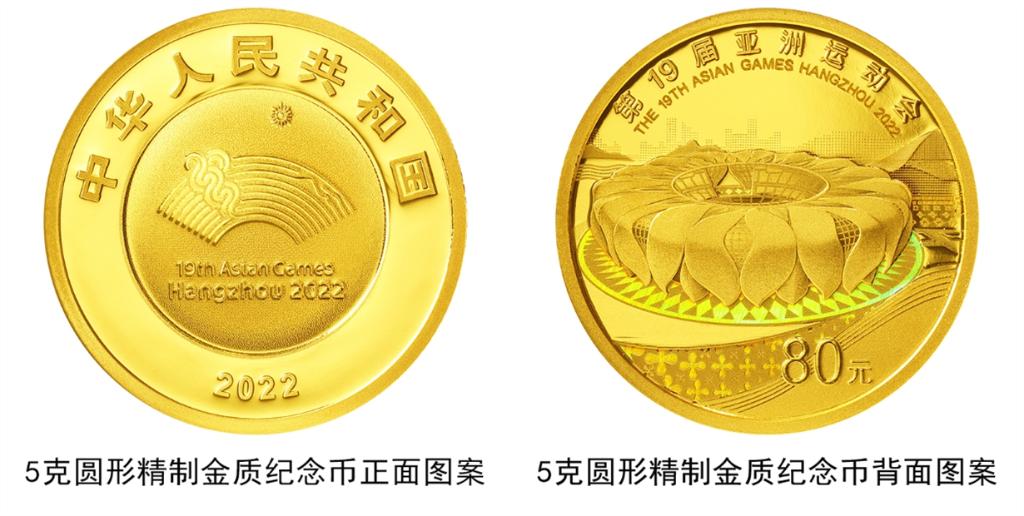 該套金銀紀念幣正面圖案均為第19屆亞洲運動會會徽,并刊國名、年號。5克圓形金質(zhì)紀念幣背面圖案為杭州奧林匹克體育中心體育場,輔以城市建筑、山水、桂花等元素裝飾組合設(shè)計,并刊“第19屆亞洲運動會”等字樣。該紀念幣含純金5克,最大發(fā)行量1萬枚。