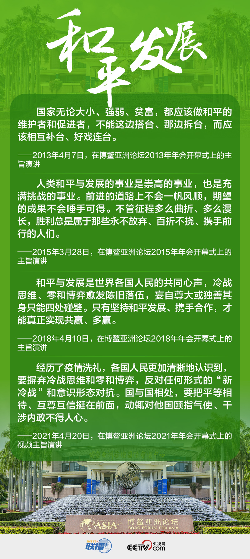 世界正處于大發(fā)展大變革大調(diào)整時(shí)期,和平與發(fā)展仍然是時(shí)代主題。在博鰲亞洲論壇這一具有世界影響力的高層次對(duì)話(huà)平臺(tái)上,習(xí)近平主席多次就此作出重要論述。