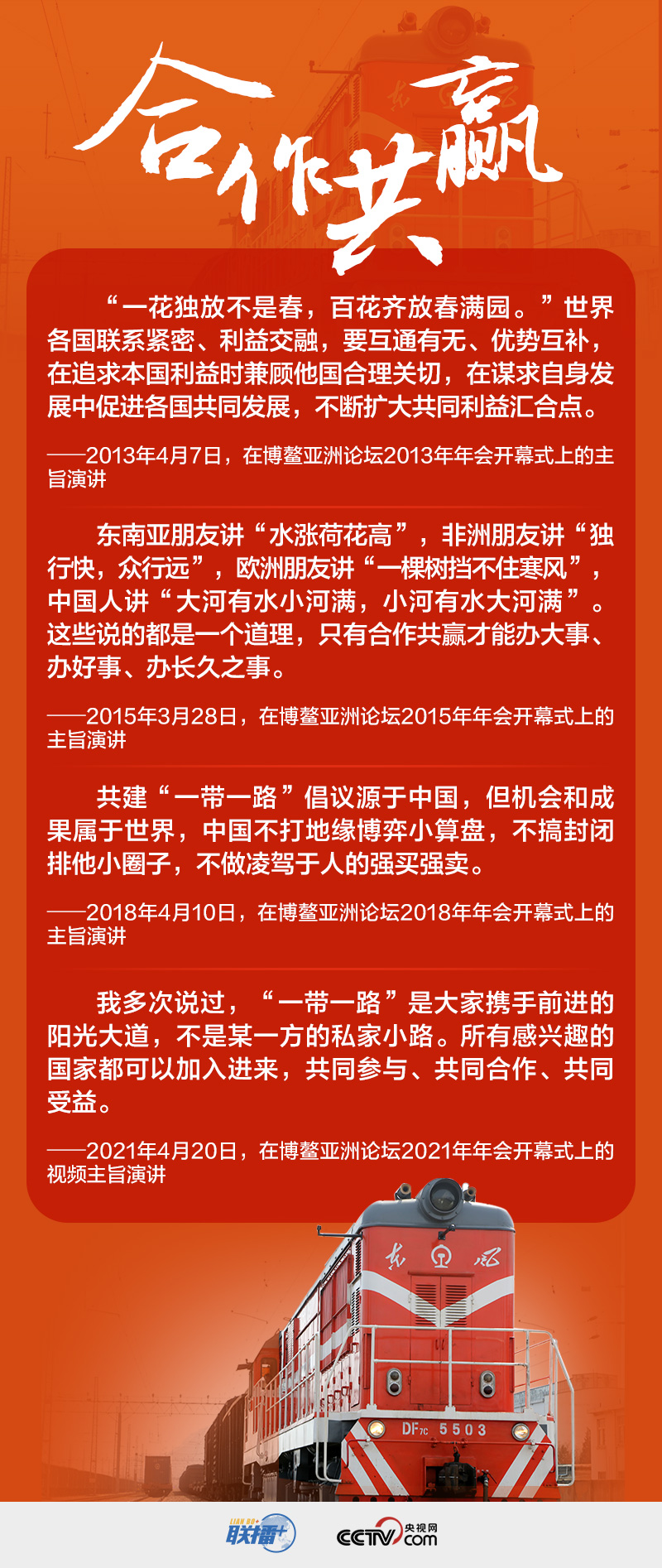 “和平發(fā)展”“開(kāi)放包容”“合作共贏”“人類(lèi)命運(yùn)共同體”……習(xí)近平主席為亞洲發(fā)展貢獻(xiàn)“中國(guó)方案”,給世界發(fā)展注入“中國(guó)信心”。央視網(wǎng)《聯(lián)播+》邀您一起溫故知新。