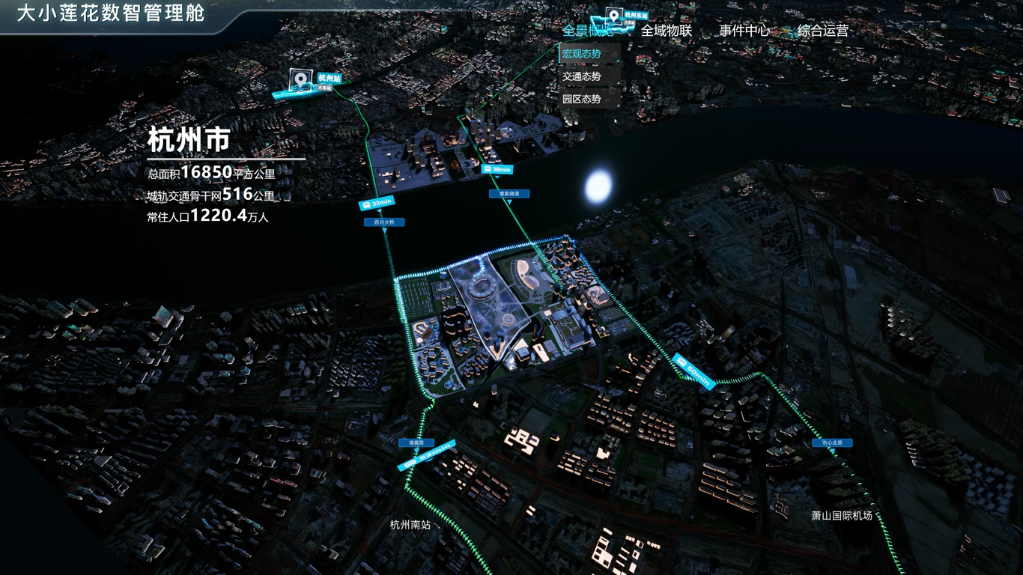 因外形酷似兩朵盛開的蓮花,杭州奧體中心主體育場和網球中心決賽館常被杭州市民昵稱為“大小蓮花”。走進奧體中心運營大廳,映入眼簾的是一塊超級大屏,名為“大小蓮花”數智管理艙,屏幕上呈現的是整個奧體園區(qū)的虛擬模型。