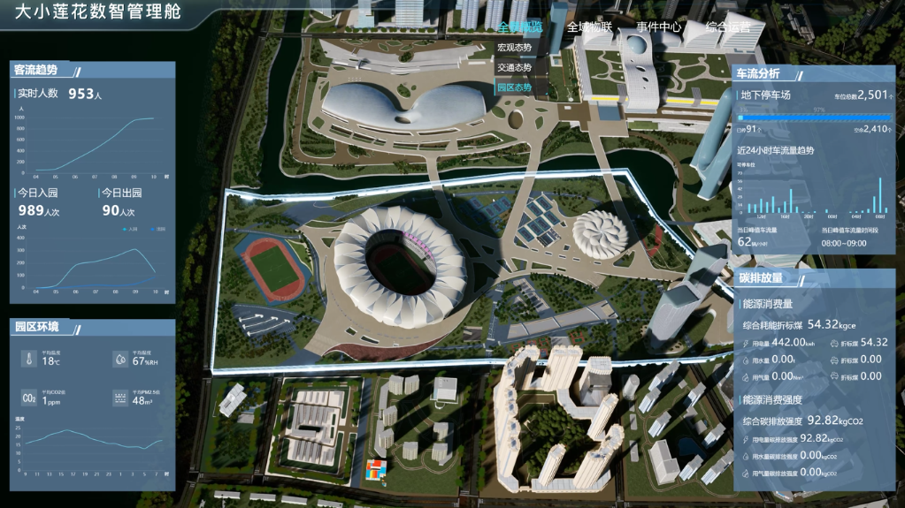 據悉,數智管理艙鏈接了整個“大小蓮花”區(qū)域內的50個弱電系統、2萬多個設備、8萬多個設備單元,可以實現對場館區(qū)域內的水、電、氣等實時能耗的監(jiān)測,還可以統計二氧化碳、碳排放量等。
