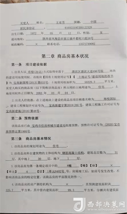 決策熱線|寶雞市民王女士(化名):我于2021年3月在寶雞市高新區(qū)渭濱大道臻和天下看了一套住宅樓,覺得地段位置也好。經(jīng)過和家人一起商議,與售樓人員確定了8幢1單元4層東戶南北通透的房子,于2021年3月18日簽訂書面商品房買賣合同,于2021年4月15日簽訂按揭貸款合同給開發(fā)商交清了房款,前期共花費七十余萬。