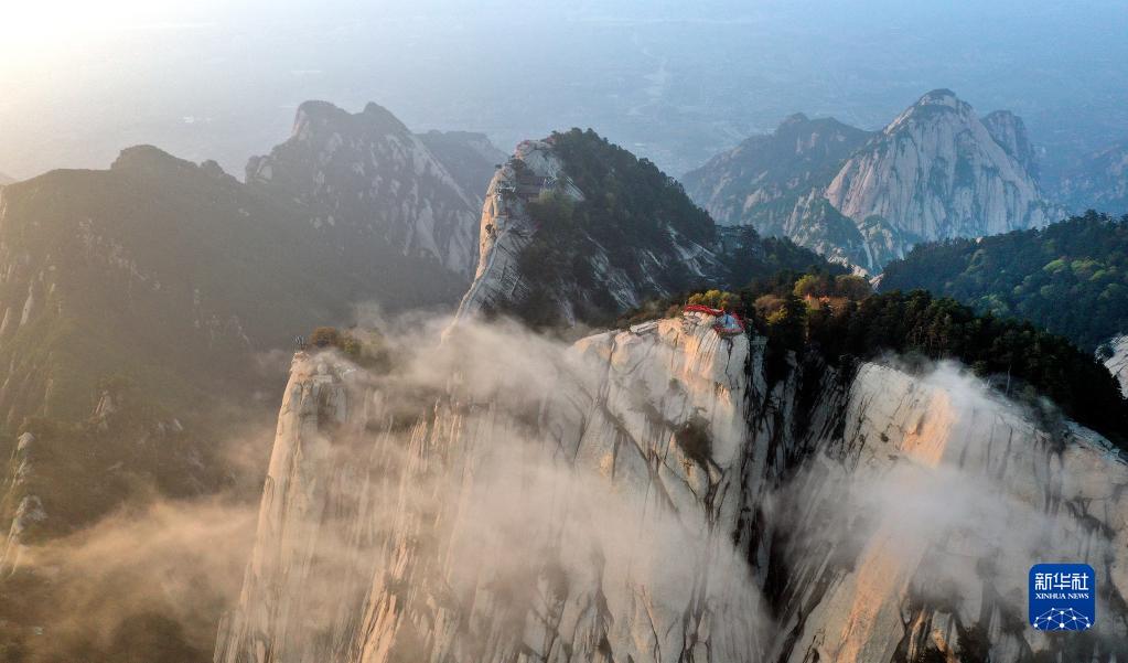 云霧中的華山南峰(4月28日攝,無人機(jī)照片)。新華社記者陶明攝
