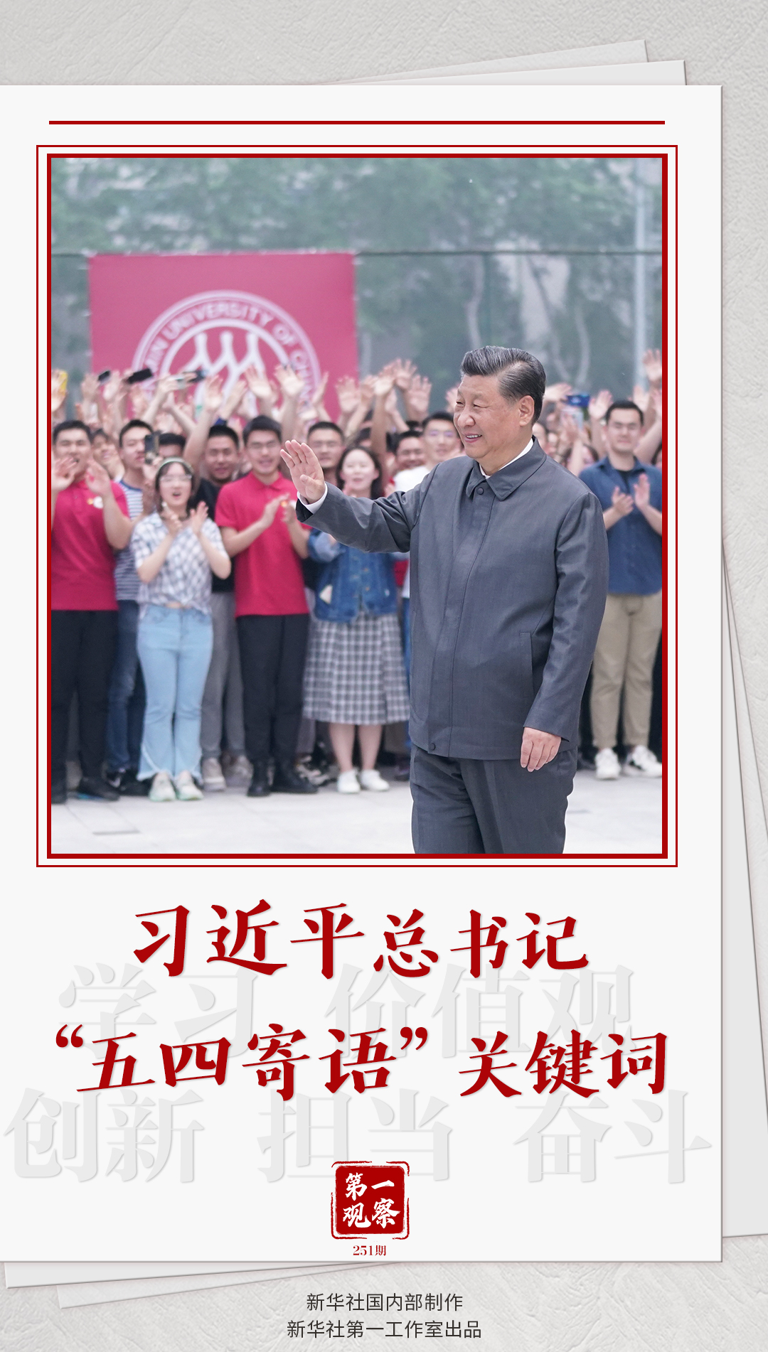 “五四運動以來的100年,是中國青年一代又一代接續(xù)奮斗、凱歌前行的100年,是中國青年用青春之我創(chuàng)造青春之中國、青春之民族的100年。”