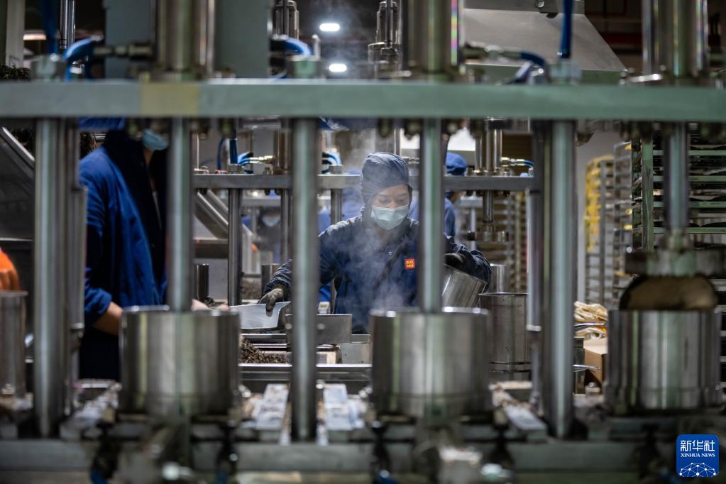 工人在西雙版納傣族自治州勐??h雨林古茶坊茶葉有限責(zé)任公司的生產(chǎn)線上制作普洱茶(5月10日攝)。新華社記者江文耀攝