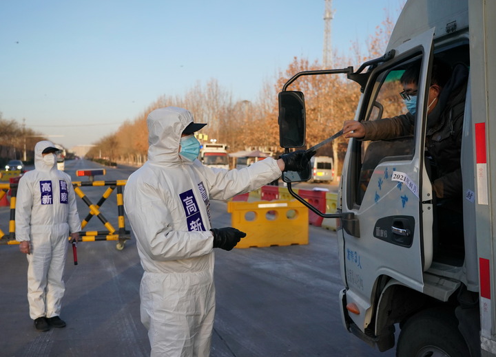 石家莊市公安局高新技術(shù)產(chǎn)業(yè)開(kāi)發(fā)區(qū)公安分局民警在藁城區(qū)通往市區(qū)的路口執(zhí)勤(2021年1月10日攝)。當(dāng)日是首個(gè)“中國(guó)人民警察節(jié)”。新華社記者 楊世堯 攝