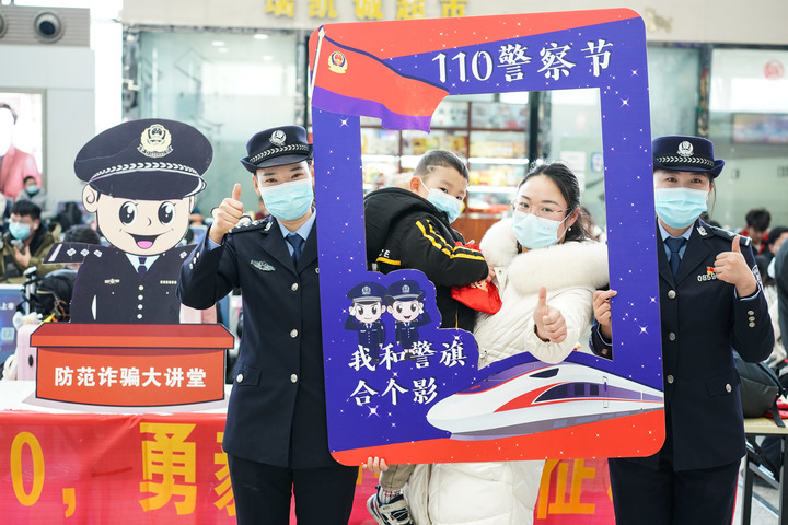 南京鐵路公安處聯(lián)合南京市公安局公交治安分局在南京火車站舉行迎接“中國(guó)人民警察節(jié)”活動(dòng),民警和旅客在活動(dòng)上合影(2022年1月7日攝)。新華社記者 季春鵬 攝