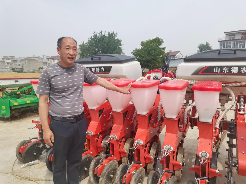 趙化向記者展示新購置的大豆玉米復(fù)式播種機。新華社記者 水金辰 攝