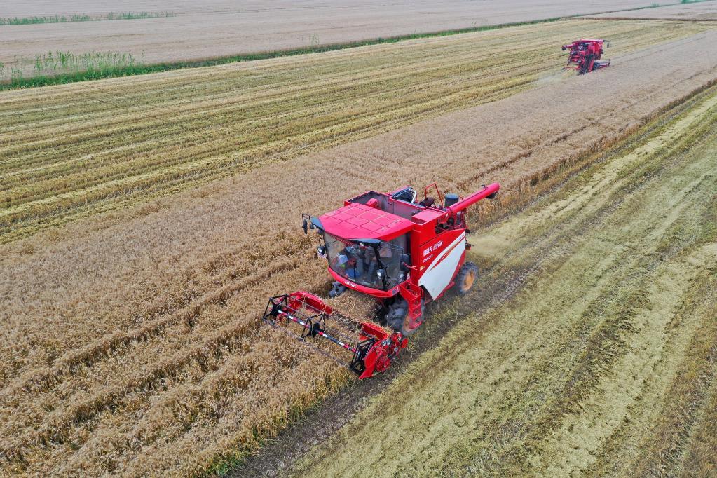 位于安徽省宿松縣的華陽河農(nóng)場機收小麥現(xiàn)場。新華社發(fā) 李龍 攝