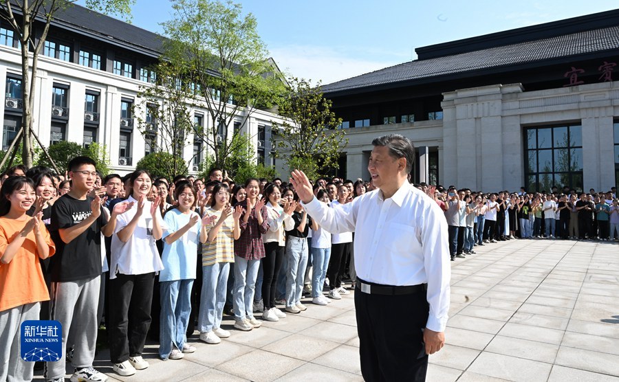 6月8日,中共中央總書記、國家主席、中央軍委主席習(xí)近平在四川考察。這是8日下午,習(xí)近平在宜賓學(xué)院考察時(shí),向師生們揮手致意。新華社記者 李學(xué)仁 攝