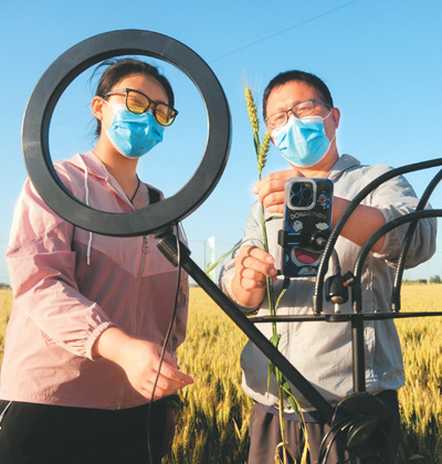 在山東省聊城市東昌府區(qū)閆寺街道周店村小麥良種繁育展示基地,負(fù)責(zé)技術(shù)的當(dāng)?shù)厍嗄暝趯?duì)小麥品種進(jìn)行直播推介。 |