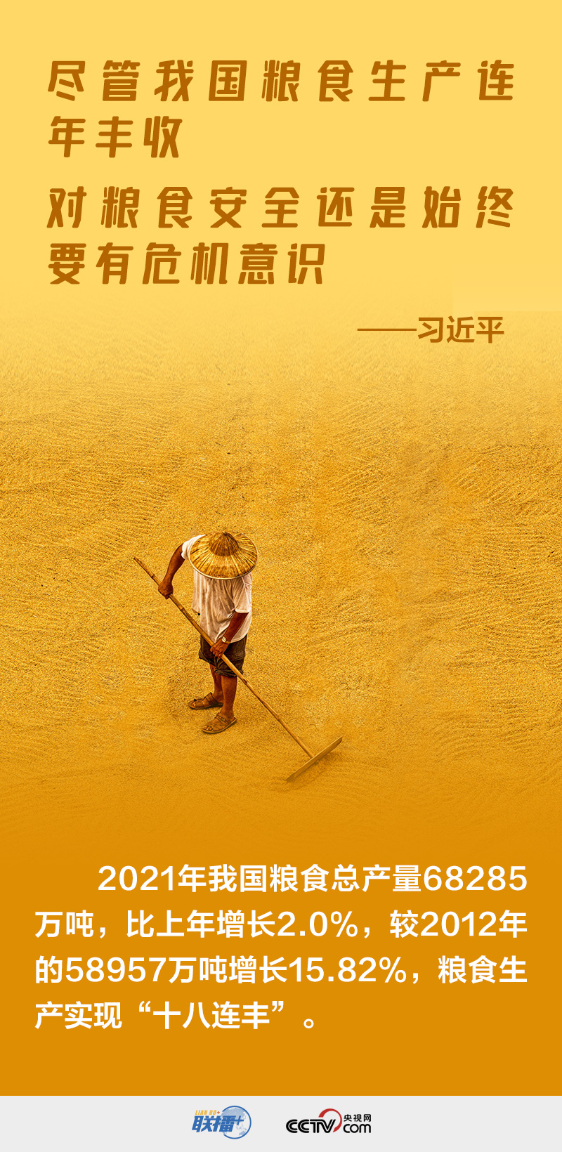 黨的十八大以來,習(xí)近平總書記對糧食安全這個(gè)“永恒課題”高度重視,時(shí)時(shí)敲響警鐘。央視網(wǎng)《聯(lián)播+》特?cái)X取總書記相關(guān)重要論述,與您一起學(xué)習(xí),始終繃緊“糧食安全”這根弦。