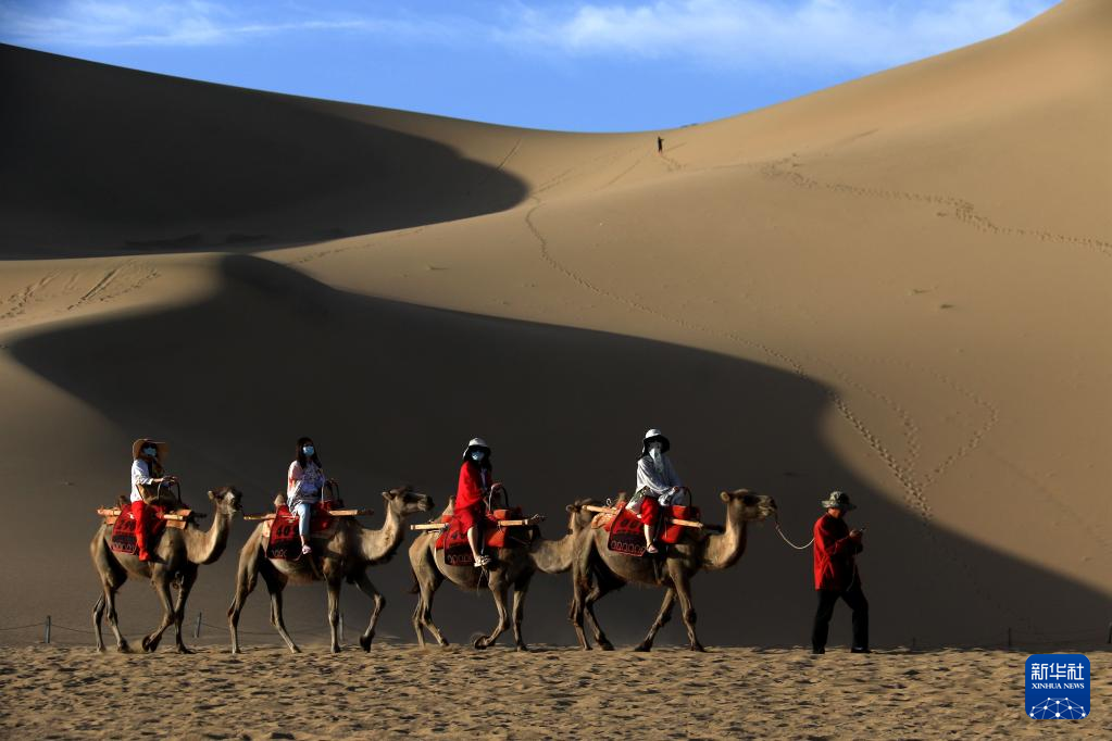 6月19日,游客在甘肅省敦煌市鳴沙山月牙泉景區(qū)騎駱駝游覽。新華社發(fā)(張曉亮 攝)