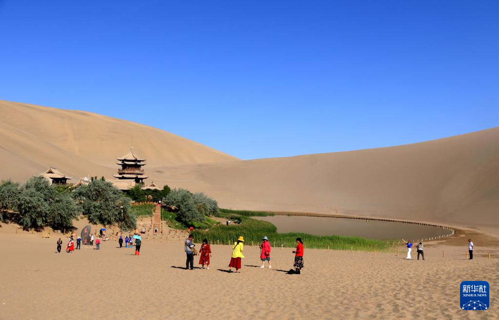 6月19日,游客在甘肅省敦煌市鳴沙山月牙泉景區(qū)游覽。新華社發(fā)(張曉亮 攝)