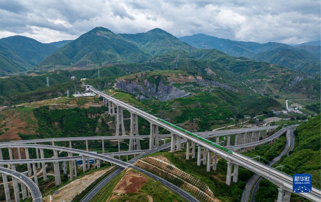 復(fù)興號列車通過中老鐵路南溪河特大橋(無人機照片,6月2日攝)。新華社記者 江文耀 攝