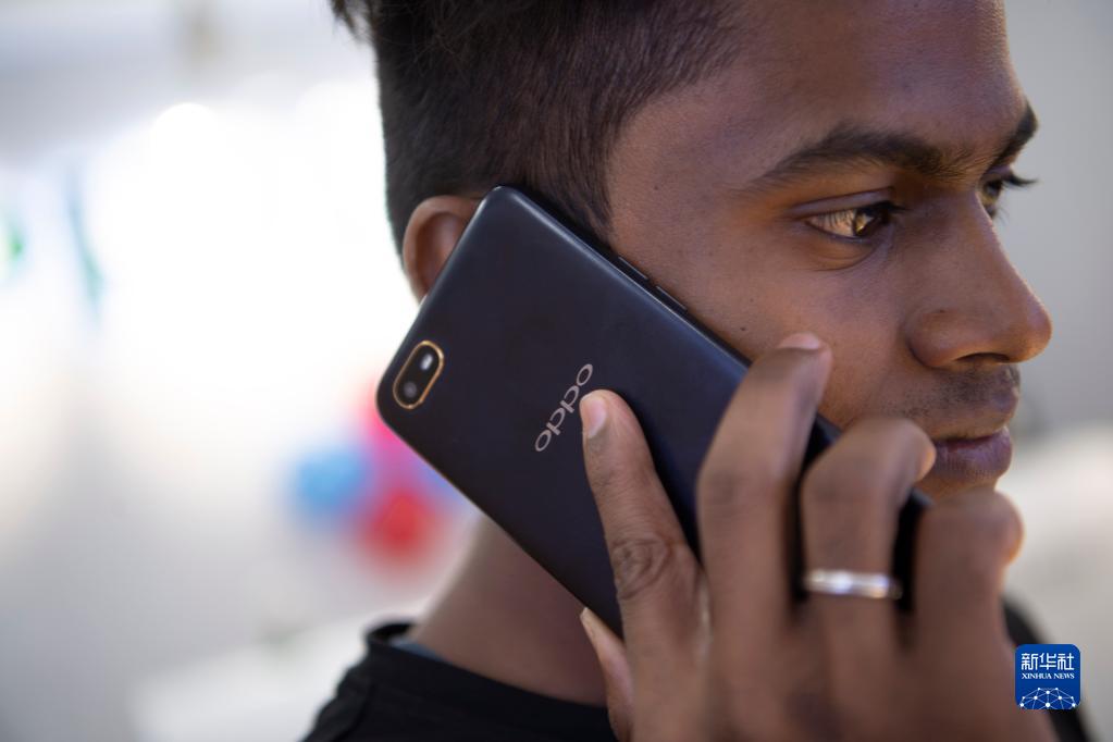 2019年10月8日,一名男子在印度金奈的一家商場(chǎng)使用中國(guó)品牌的手機(jī)。新華社記者 呂小煒 攝