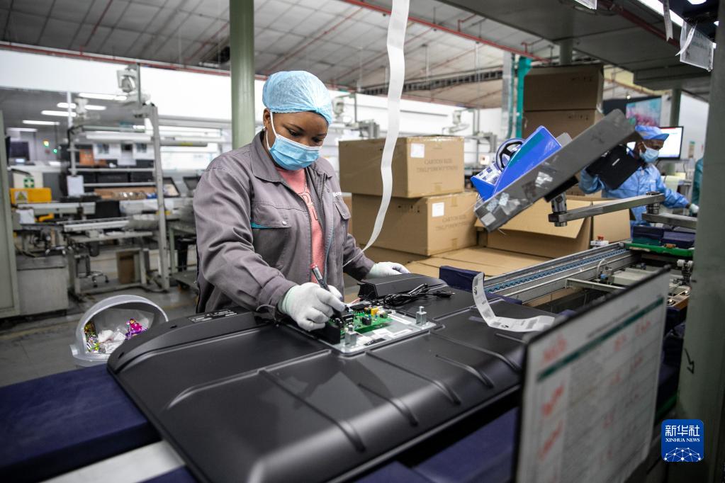 2022年6月1日,當(dāng)?shù)貑T工在南非開普敦海信南非工業(yè)園的電視機(jī)生產(chǎn)線上工作。新華社記者 呂天然 攝