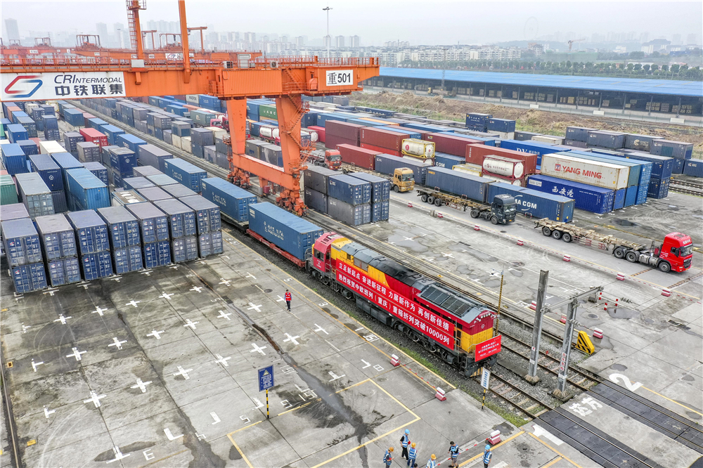 中歐班列(重慶)第10000列列車在重慶團結(jié)村中心站等待發(fā)車(2022年6月23日攝,無人機照片)。新華社記者 黃偉 攝