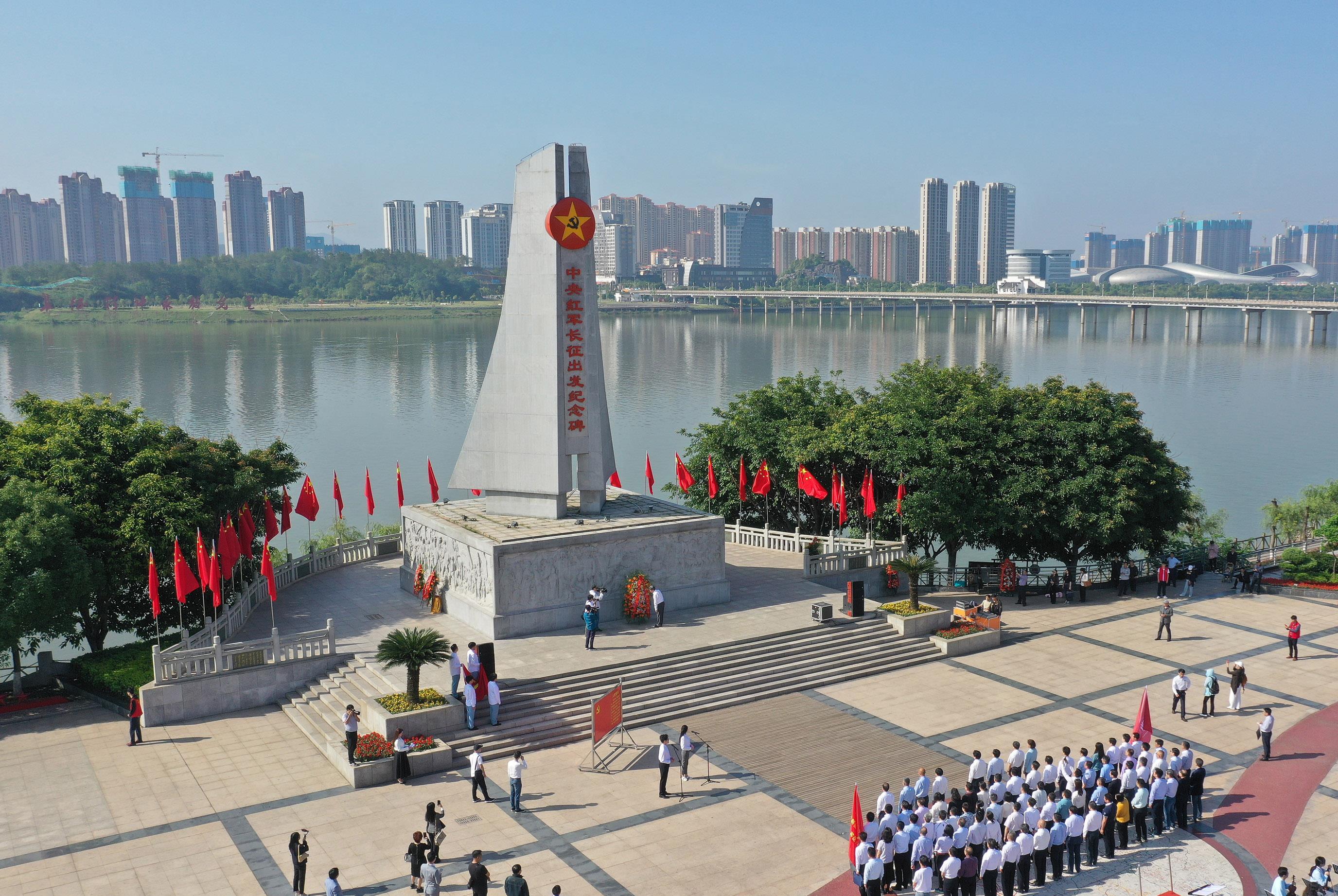 人們在江西省于都縣中央紅軍長征出發(fā)紀念碑前參加紀念活動(2021年4月30日攝,無人機照片)。新華社記者 萬象 攝