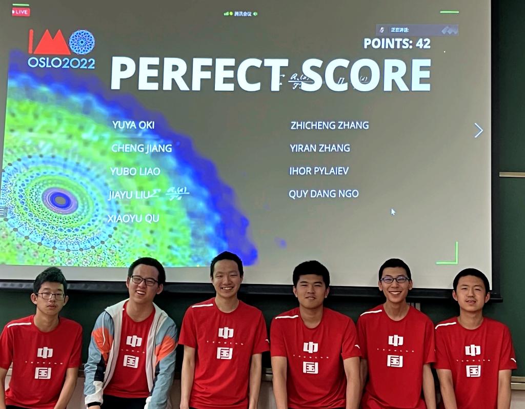 圖為中國數(shù)學奧林匹克國家隊6名隊員在成績屏前合影。