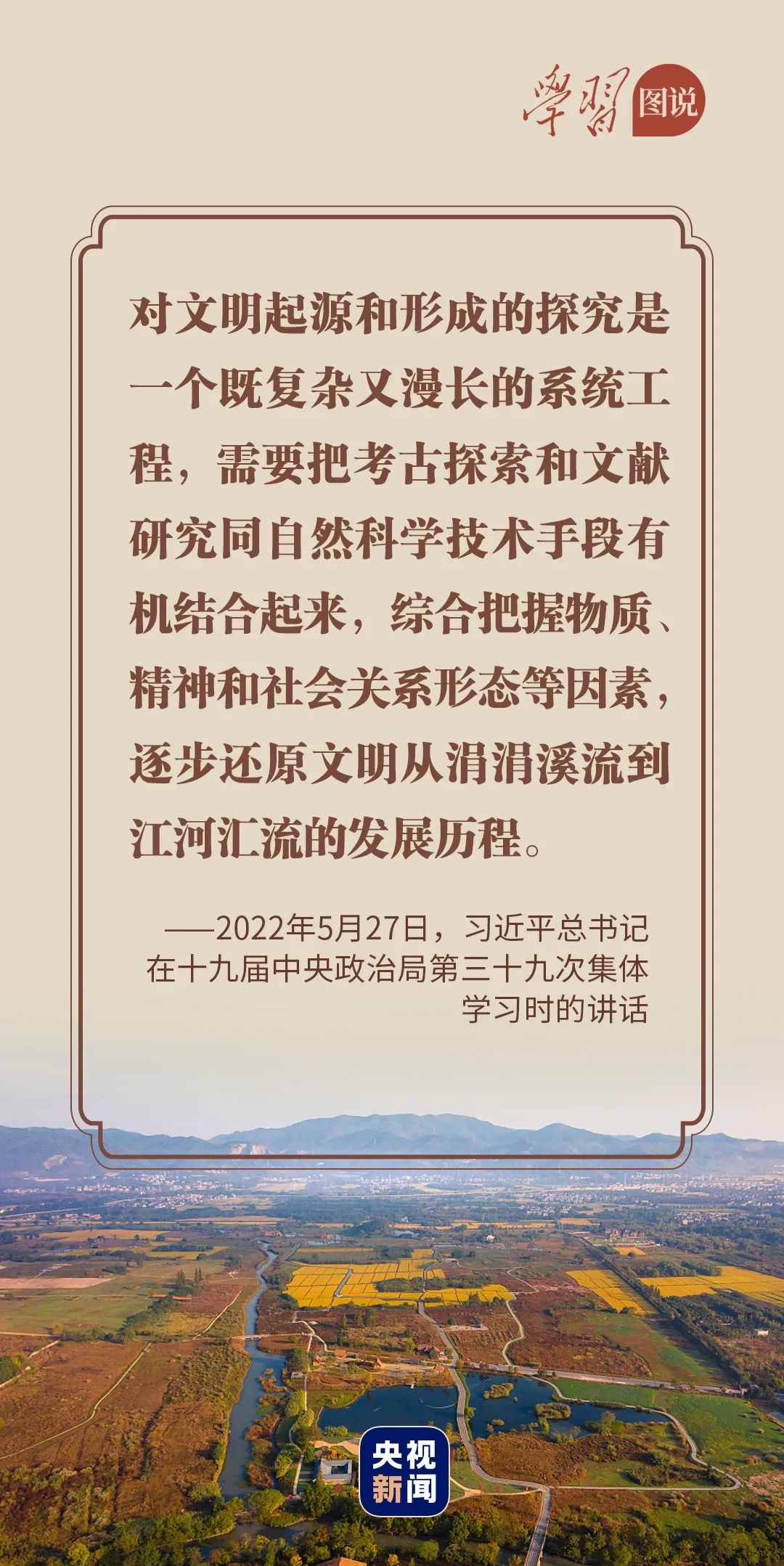 “深入了解中華文明五千多年發(fā)展史,推動把中國文明歷史研究引向深入,推動全黨全社會增強(qiáng)歷史自覺、堅(jiān)定文化自信,堅(jiān)定不移走中國特色社會主義道路,為全面建設(shè)社會主義現(xiàn)代化國家、實(shí)現(xiàn)中華民族偉大復(fù)興而團(tuán)結(jié)奮斗。”