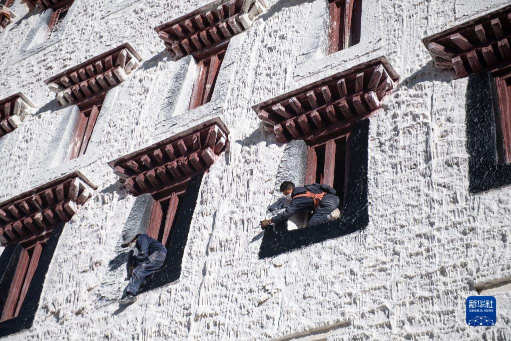2021年10月21日,工作人員進(jìn)行布達(dá)拉宮年度粉刷工作。新華社記者 孫瑞博 攝