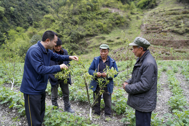 在重慶市巫溪縣天元鄉(xiāng)萬春村,專家團隊成員王大平(左一)對村民進行冬桃樹苗整形壓枝培訓(2020年4月23日攝)。新華社記者 黃偉 攝