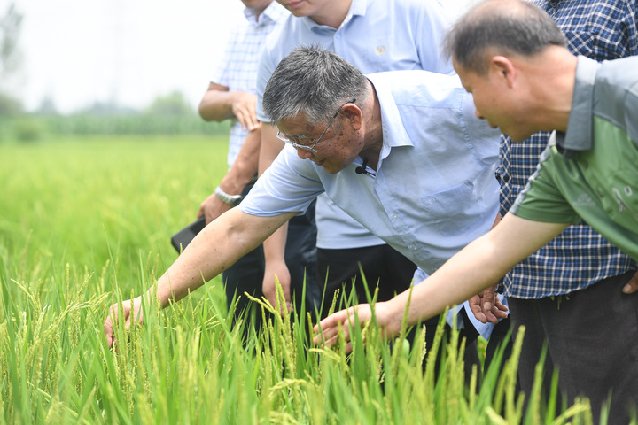 在江蘇省句容市天王鎮(zhèn)戴莊村,農(nóng)業(yè)專家趙亞夫(中)帶著團隊成員查看有機水稻長勢(2021年7月6日攝)。新華社記者 季春鵬 攝