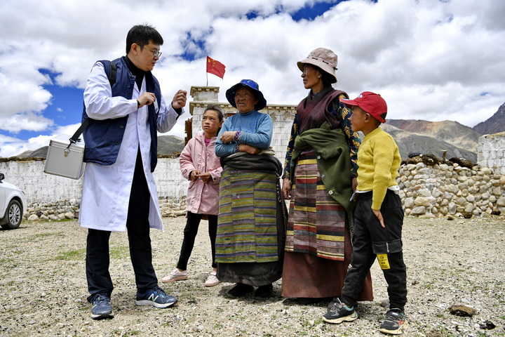 在西藏拉薩市當雄縣格達鄉(xiāng)格達村,第六批醫(yī)療人才“組團式”援藏專家王克明(左一)為村民講解健康知識(2021年6月19日攝)。新華社記者 張汝鋒 攝