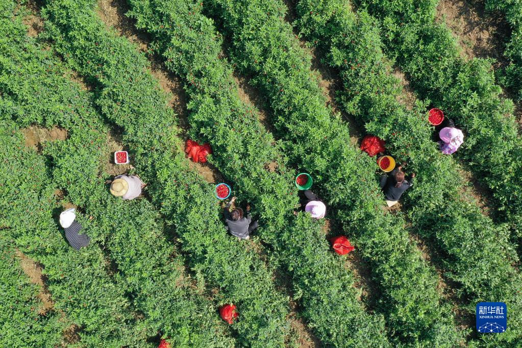 9月1日,河南省寶豐縣石橋鎮(zhèn)竹園村農(nóng)民在田間收獲草莓椒(無(wú)人機(jī)照片)。新華社發(fā)(何五昌攝)