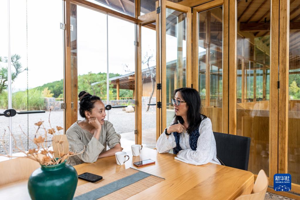 8月31日,林登的妻子瑾妮(右)向當(dāng)?shù)匚璧讣叶^蘭學(xué)習(xí)白族話。新華社記者 曹夢瑤 攝